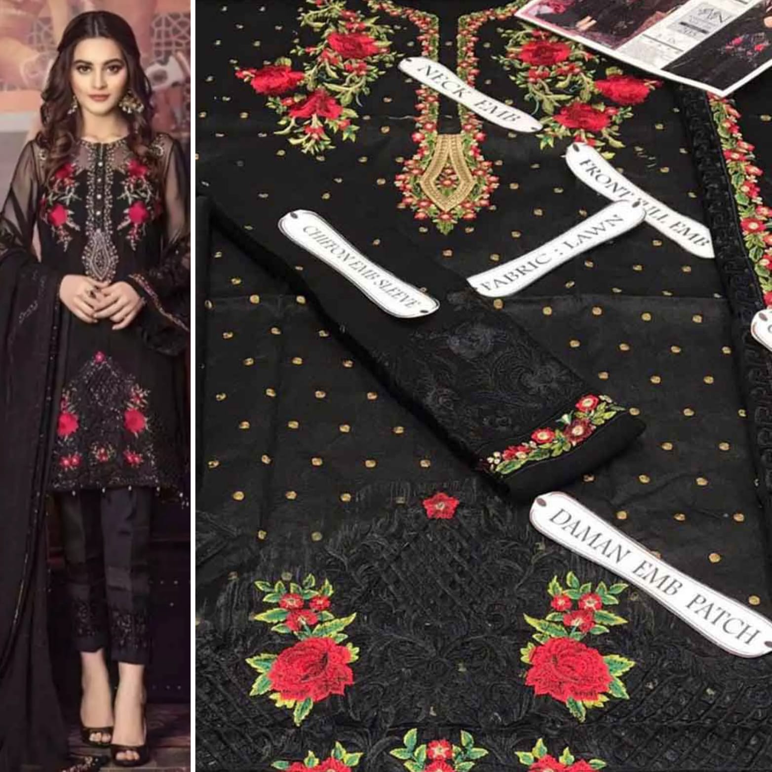 Ready to wear BLACK DRESS WITH RED AND GREEN EMBROYDAREE WORK_